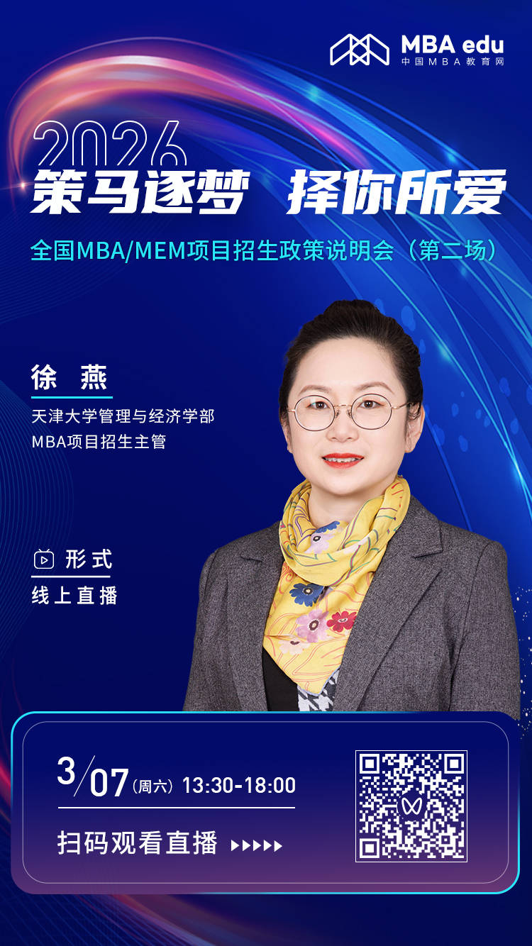 届时,天津大学管理与经济学部MBA项目招生主管徐燕老师将亲临线上直播间,深度剖析天津大学MBA的独特魅力、报考策略、复试攻略等核心资讯,并及时回应考生疑问。时不我待,敬请广大考生踊跃参与,把握关键契机,共赴梦想的商学殿堂!