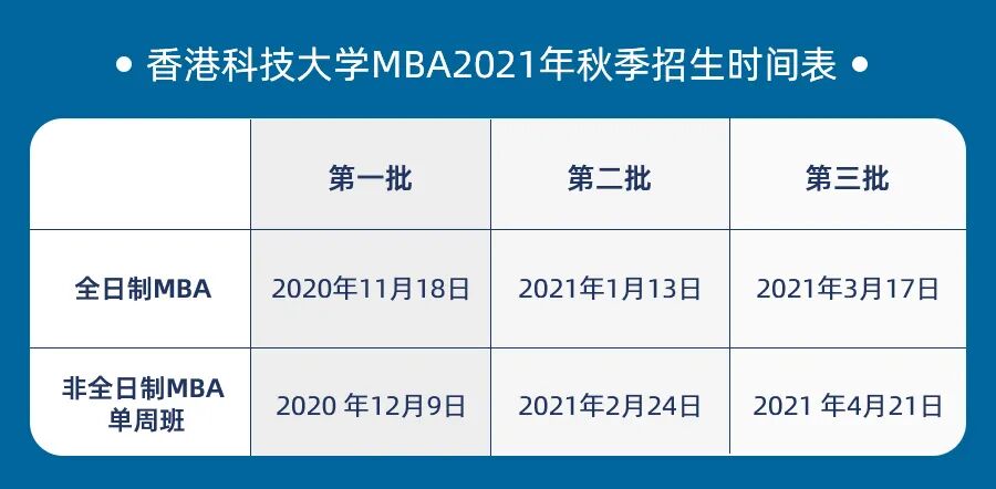 2021年秋季入学的港科大MBA招生已经启动,现正接受2021年全日制MBA和非全日制MBA单周班的申请。