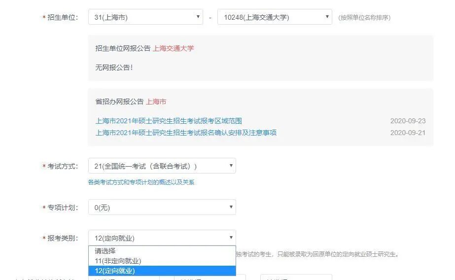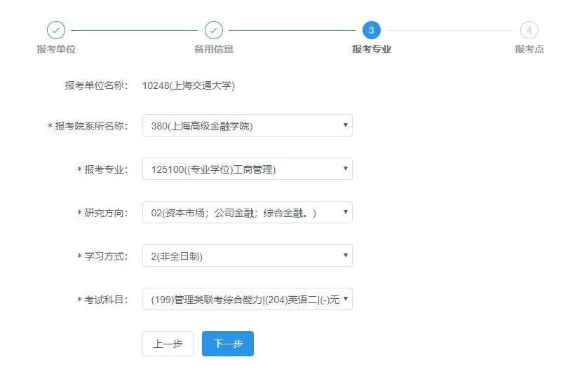 网上报名 时间:10月10日至10月31日,9:00-22:00 网址:中国研究生招生信息网,简称“研招网” (公网网址为http://yz.chsi.com.cn,教育网址为http://yz.chsi.cn) 已参与2021级上海交大高金MBA提前面试考生,请在顺利完成联考报名后,于10月19日前,请点击阅读原文链接上传《报名信息表》,或将《报名信息表》邮件至mba.admissions@saif.sjtu.edu.cn,确认报名信息。 如对于联考报名有疑问,欢迎点击报名↓ 与招生老师面对面交流,顺利完成联考报名! 01.登录中国研究生招生信息网 注册或使用学信网账号进行登录,开始网上报名(已有账号的考生可直接登陆,未注册过账号的考生注册账号后再登陆) 进入“全国硕士研究生招生考试网上报名平台”,开始网上报名 02.填写考生信息 考生必须先完成“填写考生信息”后,才能进入“填写报考信息”,“考生信息”部分内容需一次性填写完毕,包括以下步骤: 阅读《报名须知》 确认实名信息 学籍学历验证 完善及确认所有考生信息 【考生信息】部分填写常见问题 Q学籍学历部分,考生来源如何选择? A:请选择:4(其他在职人员) Q学籍学历验证部分,学历、学位证书编号怎么填? A:网上填报时,学历和学位证书编号应填写证书上的“电子注册号”,考生可登录学信档案(my.chsi.com.cn)查看本人学籍学历信息,非应届毕业生选填内容必须与已获毕业证书的一致,若在毕业学校选项中无对应毕业证书上的院校名称,则选择“其他”自行录入毕业学校名称,考生可通过学信档案提前确认本人的学历(学籍)信息。如有疑问,请与就读院校学籍学历管理部门联系。 取得国(境)外学历的考生,请填写教育部留学服务中心认证的国外学历学位证书认证书编号,旧版认证书编号样式为:教留服认美[2010]00001号,新版认证书编号样式为:120190000001,请务必与认证书上的编号保持一致。 Q学历校验未通过怎么办? A:未通过网上学历(学籍)校验的考生,为了不影响您的报考进程,可继续完成后续报名及缴费工作。但须在11月初报名确认时,提供学历(学籍)认证报告:往届生提供《教育部学历证书电子注册备案表》;国外学历上传《国外学历学位认证书》。未提供学历(学籍)认证报告的,原则上不予现场确认、不准考。 一般情况下,学历(学籍)信息是可以快速校验的。如遇网络拥堵等特殊情况,将出现“进行中”的状态,考生可以继续填写考生信息中的其他部分,不影响接下来的操作。 未通过学历(学籍)校验的考生,请务必仔细核查并更正填报的姓名、证件号码、毕业学校、毕业年月、学历、学历证书编号、学习形式等信息,如更正后仍未通过网上学历(学籍)校验的考生,国内学历应及时到中国高等教育学生信息网进行学历(学籍)认证,国外学历应及时到教育部留学服务中心进行认证。在现场确认时按照报考点要求将认证报告交报考点。 如果考生持有2002年之前毕业的国内高等教育学历证书,或2002年之后毕业但未在高校学生学历信息管理系统相关数据库中注册的国内高等教育学历证书可在学信网(https://www.chsi.com.cn/wssq/)申请书面学历认证。凡2002年(毕业时间)起已在高校学生学历信息管理系统相关数据库中注册的高等教育学历证书,原则上实行网上查询和电子认证,不再受理和出具书面认证报告。 Q户籍档案相关信息如何填写? A:请如实填写户籍档案所在单位,如不知道户籍档案所在单位,请填写户口所在地的人才交流中心,后期可将档案移交过去。按照国家规定,个人档案不得由个人持有。 全日制考生须如实填写户籍档案相关信息,并在网上确认(现场确认)时仔细核对,录取后调档使用。 03.填写报考信息 报名期间,考生可自行修改网上报名信息或重新填报报名信息。为避免多占考位,影响其他考生报考,一名考生只能保留一条有效报名信息。 报考单位信息(请务必按如下信息填写) 招生单位:31(上海市)-10248(上海交通大学) 考试方式:21(全国统一考试(含联合考试)) 专项计划:0(无) 报考类别: 全日制MBA:11(非定向就业) 在职制MBA:12(定向就业) 定向就业单位及所在地(在职制考生必填):按照目前工作单位如实填写即可 备用信息 备用信息无需填写,请直接进入“报考专业”填写 报考专业信息(请务必按如下信息填写) 报考单位:10248(上海交通大学) 报考院系所名称:380(上海高级金融学院) 报考专业:125100((专业学位)工商管理) 报考研究方向和学习方式: 全日制MBA:01(资本市场;公司金融;综合金融)-1(全日制) 在职制MBA:02(资本市场;公司金融;综合金融。)-2-(非全日制) 考试科目: 199(管理类联考综合能力) 204(英语二) 选择报考点【重要】 考生应选择工作或户口所在地省级教育招生考试机构指定的报考点办理网上报名和网上确认(现场确认)手续。 上海地区考生:上海交通大学考点(3105) 本市户籍考生须提供本人上海市户口簿 非本市户籍考生需提供2020年连续6个月的上海社保缴费成功记录 北京地区考生:北京印刷学院(1115)、北京石油化工学院(1117)、北京第二外国语学院(1131) 京籍考生须提供本人北京市户口簿 京外户籍在京工作考生须提供工作单位缴纳的近六个月(4-9月份)社保证明 其他地区考生:根据户口或工作所在地省级教育招生考试机构指定的报考点要求 确认报名及缴费 校对所有已填报的信息确认无误后,生成考生报名号,请牢记报名号,并下载报名信息表。生成报名号后本次报名才为成功;如果选择的报考点采取