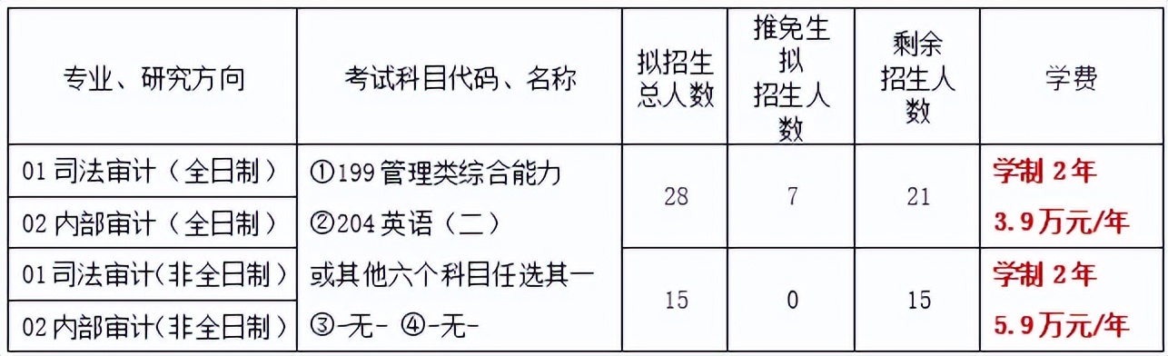 2026年,中国政法大学商学院开设全日制和非全日制审计专硕(代码:125700)。招生对象为所有自愿报考2026年中国政法大学审计专业硕士的校内外优秀大学生,报非全日制研究生只能选择“定向就业”。招生人数、学制、学费等见下表: