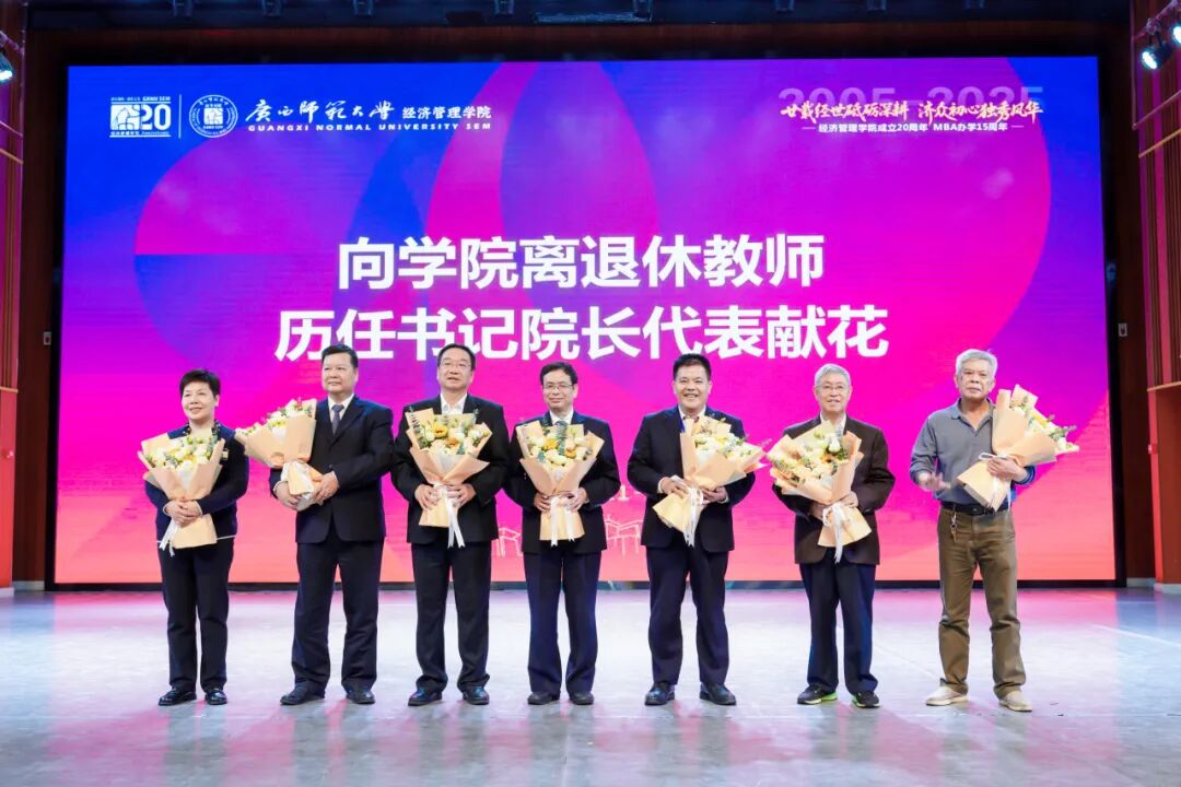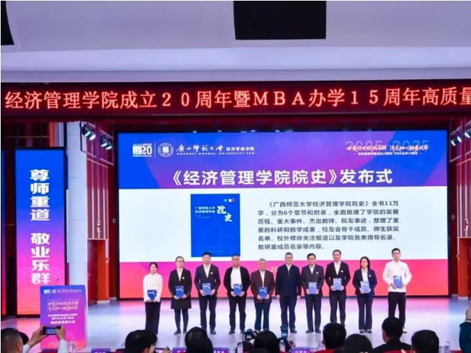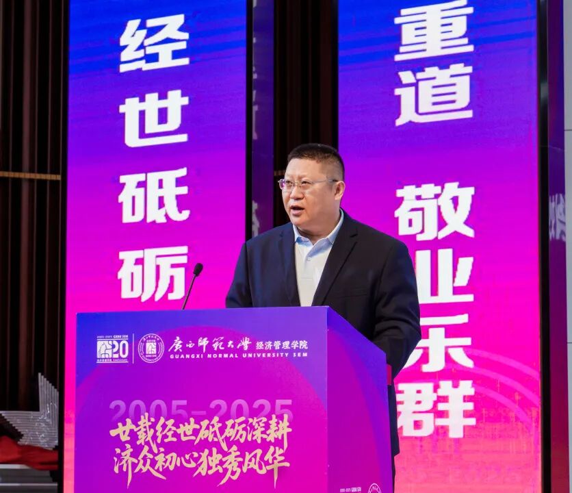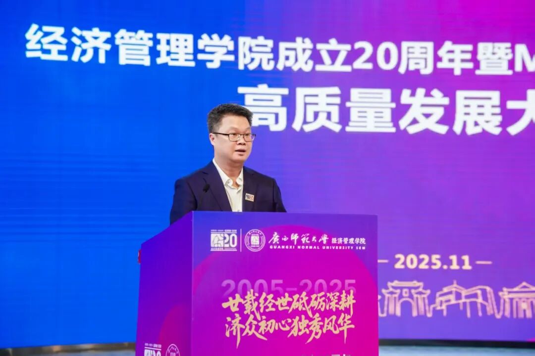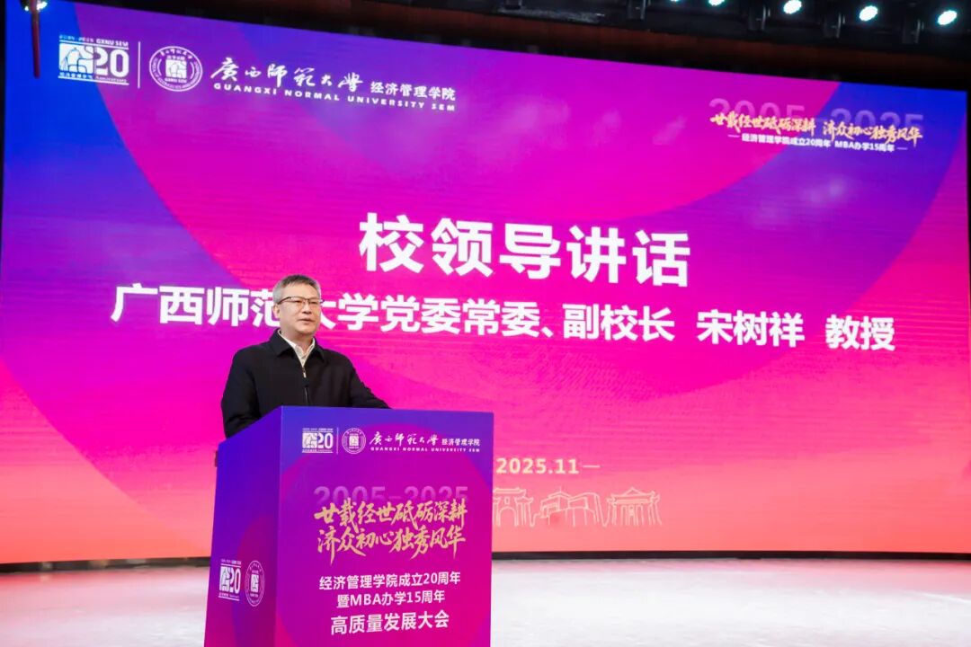 廿载经世砥砺深耕,济众初心独秀风华。11月8日上午,广西师范大学经济管理学院成立20周年暨MBA办学15周年高质量发展大会在雁山校区音乐学院三楼综合厅顺利举行。广西师范大学党委常委、副校长宋树祥,桂林电子科技大学原总会计师曹辉景出席大会。南京师范大学商学院、桂林电子科技大学商学院、桂林航天工业学院管理学院、桂林旅游学院商学院、桂林学院金融与法律学院主要负责人,校外专家学者代表、行业代表、院友代表,学校职能部门、学院(部)负责人,学院全体教职员工、离退休教师、学生代表共550余人相聚雁栖湖畔,追忆峥嵘岁月,共绘发展新篇。大会由学院党委书记陈国华主持。